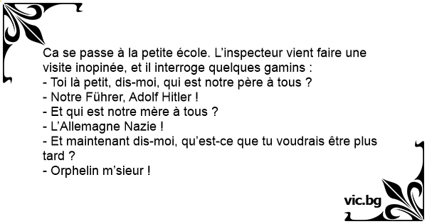 Ca se passe à la petite école. L’inspecteur vient faire une visite inopinée, et il interroge quelques gamins :