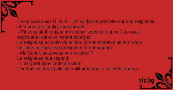 Een amerikaanse GI soldaat komt al lopend op een kruispunt en ziet er een non staan. Hij vraagt: "Zuster, mag ik mij even verbergen onder uw rok ik leg het later wel uit." De non gaat enthousiast...