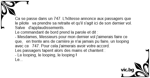 Le commandant de bord, ému, se lance dans la manoeuvre, l'avion entame son cercle et le looping réussit. Les passagers applaudissent pendant cinq bonnes minutes puis reprennent :