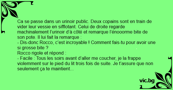 Ca se passe dans un urinoir public. Deux copains sont en train de vider leur vessie en sifflotant. Celui de droite regarde machinalement l’urinoir d’à côté et remarque l’énooorme bite de son pote. Il lui fait la remarque :
