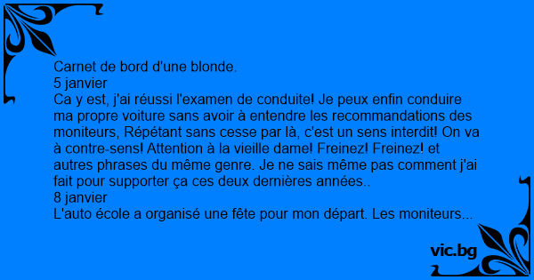Ca y est, j'ai réussi l'examen de conduite! Je peux enfin conduire ma propre voiture sans avoir à entendre les recommandations des moniteurs, Répétant sans cesse par là, c'est un sens interdit! On va à contre-sens! Attention à la vieille dame! Freinez! Freinez! et autres phrases du même genre. Je ne sais même pas comment j'ai fait pour supporter ça ces deux dernières années..