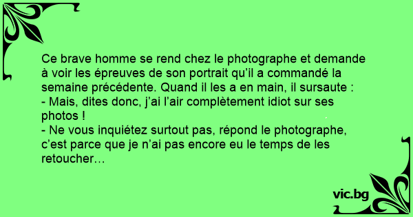 Ce brave homme se rend chez le photographe et demande à voir les épreuves de son portrait qu’il a commandé la semaine précédente. Quand il les a en main, il sursaute :