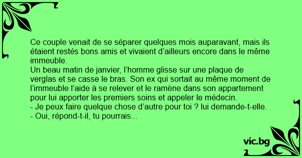 Un beau matin de janvier, l’homme glisse sur une plaque de verglas et se casse le bras. Son ex qui sortait au même moment de l’immeuble l’aide à se relever et le ramène dans son appartement pour lui apporter les premiers soins et appeler le médecin.