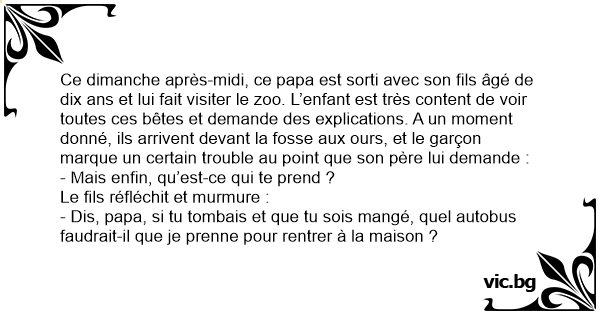 Ce dimanche après-midi, ce papa est sorti avec son fils âgé de dix ans et lui fait visiter le zoo. L’enfant est très content de voir toutes ces bêtes et demande des explications. A un moment donné, ils arrivent devant la fosse aux ours, et le garçon marque un certain trouble au point que son père lui demande :