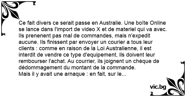 Ce fait divers ce serait passe en Australie. Une boîte Online se lance dans l'import de video X et de materiel qui va avec. Ils prenenent pas mal de commandes, mais n'expedit aucune. Ils finissent par envoyer un courier a tous leur clients : comme en raison de la Loi Australienne, il est interdit de vendre ce type d'equipement, ils doivent leur rembourser l'achat. Au courrier, ils joignent un chèque de dédommagement du montant de la commande.