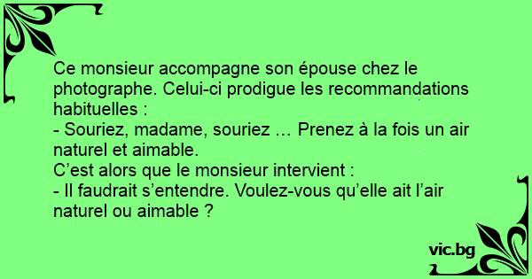 Ce monsieur accompagne son épouse chez le photographe. Celui-ci prodigue les recommandations habituelles :