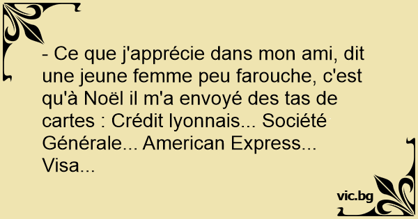- Ce que j'apprécie dans mon ami, dit une jeune femme peu farouche, c'est qu'à Noël il m'a envoyé des tas de cartes : Crédit lyonnais... Société Générale... American Express... Visa...