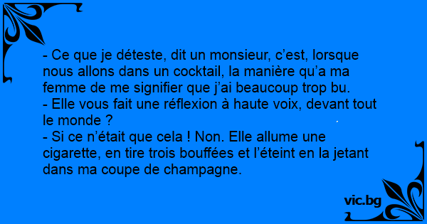 - Ce que je déteste, dit un monsieur, c’est, lorsque nous allons dans un cocktail, la manière qu’a ma femme de me signifier que j’ai beaucoup trop bu.