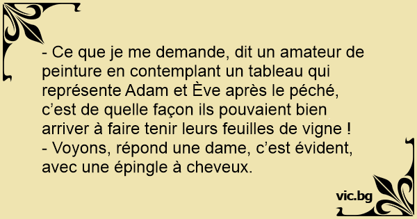 - Ce que je me demande, dit un amateur de peinture en contemplant un tableau qui représente Adam et Ève après le péché, c’est de quelle façon ils pouvaient bien arriver à faire tenir leurs feuilles de vigne !