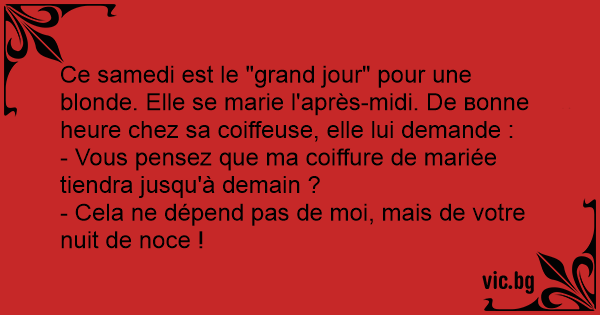 Ce samedi est le "grand jour" pour une blonde. Elle se marie l'après-midi. De воnnе heure chez sa coiffeuse, elle lui demande :