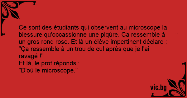 Ce sont des étudiants qui observent au microscope la blessure qu'occassionne une piqûre. Ça ressemble à un gros rond rose. Et là un élève impertinent déclare :