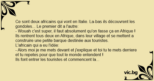 Ce sont deux africains qui vont en Italie. La-bas ils découvrent les gondoles... Le premier dit a l'autre: