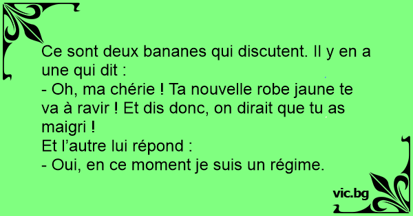 Ce sont deux bananes qui discutent. Il y en a une qui dit : - Oh, ma chérie ! Ta nouvelle robe jaune te va à ravir ! Et dis donc, on dirait que tu as maigri ! Et l’autre lui répond : - Oui, en ce moment je suis un régime.