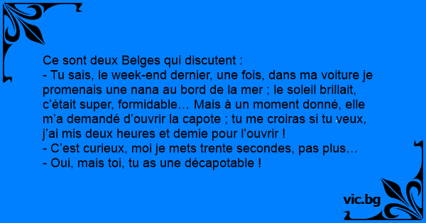 - Tu sais, le week-end dernier, une fois, dans ma voiture je promenais une nana au bord de la mer ; le soleil brillait, c’était super, formidable… Mais à un moment donné, elle m’a demandé d’ouvrir la capote ; tu me croiras si tu veux, j’ai mis deux heures et demie pour l’ouvrir !