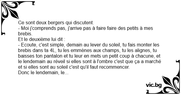 - Ecoute, c'est simple, demain au lever du soleil, tu fais monter les brebis dans ta 4L, tu les emmènes aux champs, tu les alignes, tu baisses ton pantalon et tu leur en mets un petit coup à chacune, et le lendemain au réveil si elles sont à l'ombre c'est que ça a marché et si elles sont au soleil c'est qu'il faut recommencer.