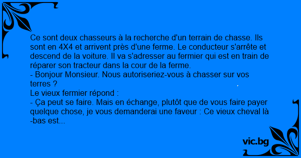 - « OK » et retourne vers sa voiture. Tout en marchant, il se dit qu'il va faire une blague à son copain resté dans le 4X4… Il monte dans la voiture et quand son copain lui demande ce qu'a dit le fermier, il répond :