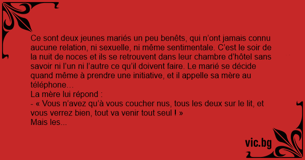 Appelée une deuxième fois au téléphone, la mère du marié lui suggère qu’ils se glissent tous les deux sous les couvertures et qu’ils se collent l’un à l’autre. A ce moment la nature devrait leur montrer le chemin !