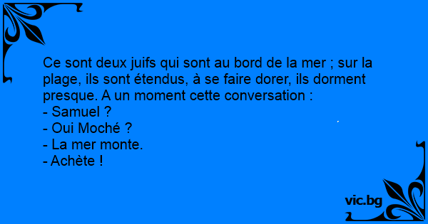 Ce sont deux juifs qui sont au bord de la mer ; sur la plage, ils sont étendus, à se faire dorer, ils dorment presque. A un moment cette conversation :
