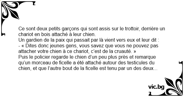 Puis le policier regarde le chien d’un peu plus près et remarque qu’un morceau de ficelle a été attaché autour des testicules du chien, et que l’autre bout de la ficelle est tenu par un des deux jeunes garçons.