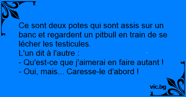 Ce sont deux potes qui sont assis sur un banc et regardent un pitbull en train de se lécher les testicules.