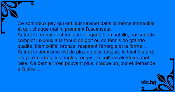 Ce sont deux psy qui ont leur cabinet dans le même immeuble et qui, chaque matin, prennent l'ascenseur.