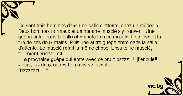 Ce sont trois hommes dans une salle d'attente, chez un médecin. Deux hommes normaux et un homme musclé s'y trouvent. Une guêpe entre dans la salle et embète le mec musclé. Il se lève et la tue de ses deux mains. Puis une autre guêpe entre dans la salle d'attente. Le musclé refait la même chose. Ensuite, le musclé, tellement énervé, dit: