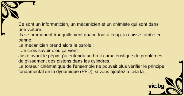 Ce sont un informaticien, un mécanicien et un chimiste qui sont dans une voiture.
