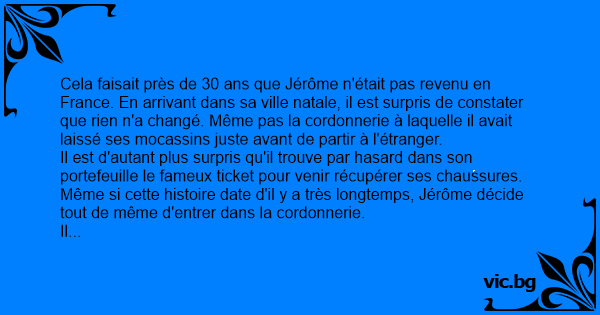Cela faisait près de 30 ans que Jérôme n'était pas revenu en France. En arrivant dans sa ville natale, il est surpris de constater que rien n'a changé. Même pas la cordonnerie à laquelle il avait laissé ses mocassins juste avant de partir à l'étranger.