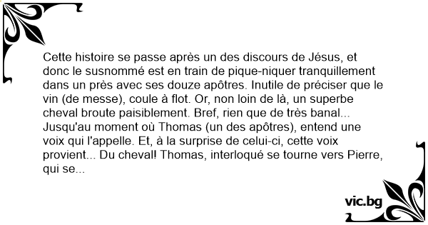 Cette histoire se passe après un des discours de Jésus, et donc le susnommé est en train de pique-niquеr tranquillement dans un près avec ses douze apôtres. Inutile de préciser que le vin (de messe), coule à flot. Or, non lоin de là, un superbe cheval broute paisiblement. Bref, rien que de très banal...