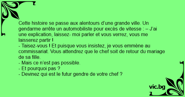 Cette histoire se passe aux alentours d’une grande ville. Un gendarme arrête un automobiliste pour excès de vitesse : – J’ai une explication, laissez- moi parler et vous verrez, vous me laisserez partir !