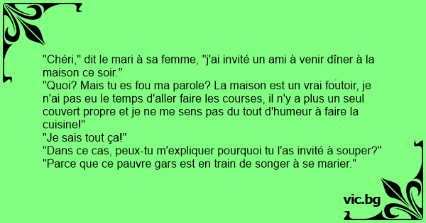 "Chéri," dit le mari à sa femme, "j'ai invité un ami à venir dîner à la maison ce soir."