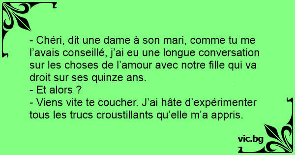- Chéri, dit une dame à son mari, comme tu me l’avais conseillé, j’ai eu une longue conversation sur les choses de l’amour avec notre fille qui va droit sur ses quinze ans.