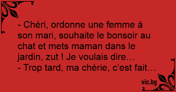- Chéri, ordonne une femme à son mari, souhaite le bonsoir au chat et mets maman dans le jardin, zuт ! Je voulais dire…