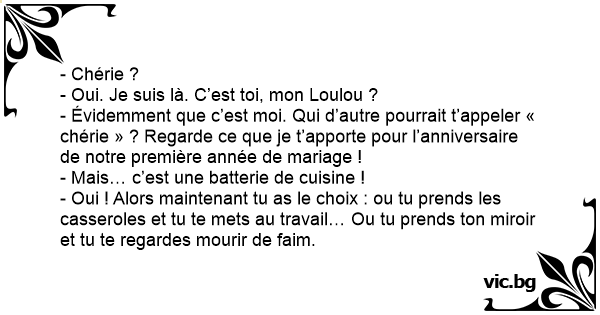 - Évidemment que c’est moi. Qui d’autre pourrait t’appeler « chérie » ? Regarde ce que je t’apporte pour l’anniversaire de notre première année de mariage !