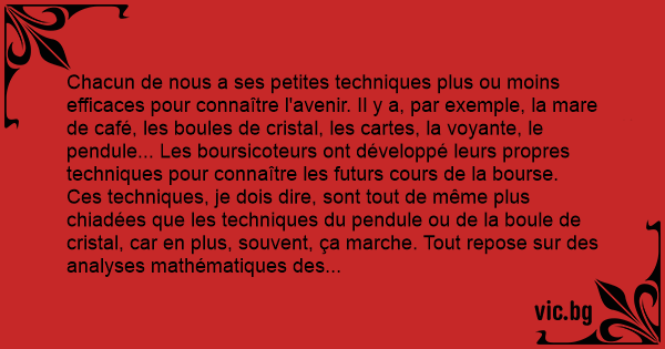 Chacun de nous a ses petites techniques plus ou moins efficaces pour connaître l'avenir. Il y a, par exemple, la mare de café, les boules de cristal, les cartes, la voyante, le pendule... Les boursicoteurs ont développé leurs propres techniques pour connaître les futurs cours de la bourse.