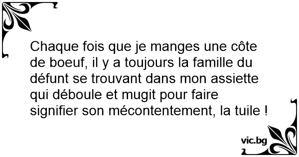Chaque fois que je manges une côte de boeuf, il y a toujours la famille du défunt se trouvant dans mon assiette qui déboule et mugit pour faire signifier son mécontentement, la tuile !