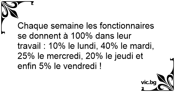 Chaque semaine les fonctionnaires se donnent à 100% dans leur travail : 10% le lundi, 40% le mardi, 25% le mercredi, 20% le jeudi et enfin 5% le vendredi !