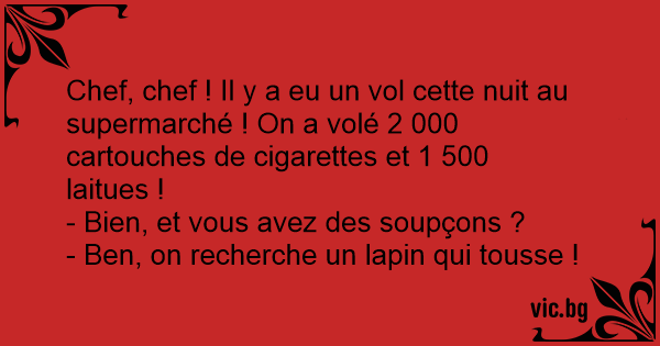 Chef, chef ! Il y a eu un vol cette nuit au supermarché ! On a volé 2 000 cartouches de cigarettes et 1 500 laitues !