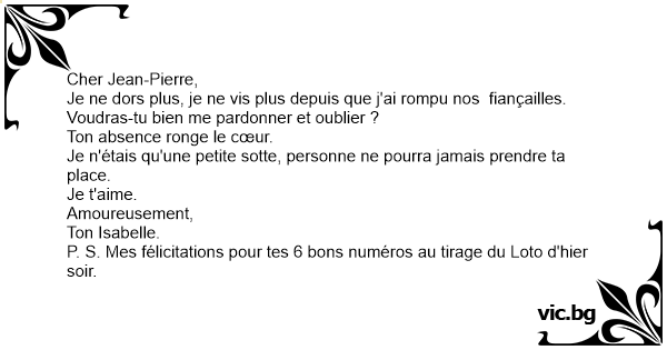 P. S. Mes félicitations pour tes 6 bons numéros au tirage du Loto d'hier soir.
