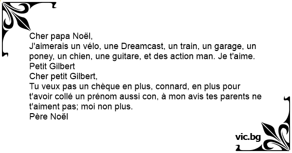 J'aimerais un vélo, une Dreamcast, un train, un garage, un poney, un chien, une guitare, et des action man. Je t'aime.