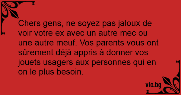 Chers gens, ne soyez pas jaloux de voir votre ex avec un autre mec ou une autre meuf. Vos parents vous ont sûrement déjà appris à donner vos jouets usagers aux personnes qui en on le plus besoin.