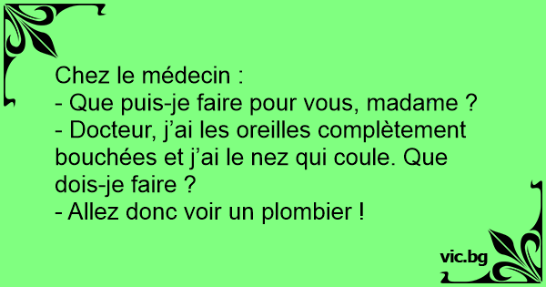 - Docteur, j’ai les oreilles complètement bouchées et j’ai le nez qui coule. Que dois-je faire ?