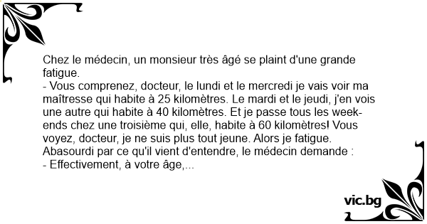 Chez le médecin, un monsieur très âgé se plaint d'une grande fatigue. - Vous comprenez, docteur, le lundi et le mercredi je vais voir ma maîtresse qui habite à 25 kilomètres. Le mardi et le jeudi, j'en vois une autre qui habite à 40 kilomètres. Et je passe tous les week-ends chez une troisième qui, elle, habite à 60 kilomètres! Vous voyez, docteur, je ne suis plus tout jeune. Alors je fatigue. Abasourdi par ce qu'il vient d'entendre, le médecin demande : - Effectivement, à votre âge, toutes ces maîtresses un peu partout! Mais comment faites-vous? - Ah, mais j'ai un vélo!