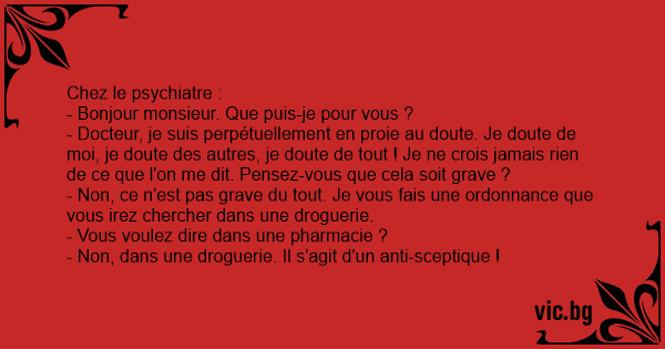 - Docteur, je suis perpétuellement en proie au doute. Je doute de moi, je doute des autres, je doute de tout ! Je ne crois jamais rien de ce que l'on me dit. Pensez-vous que cela soit grave ?