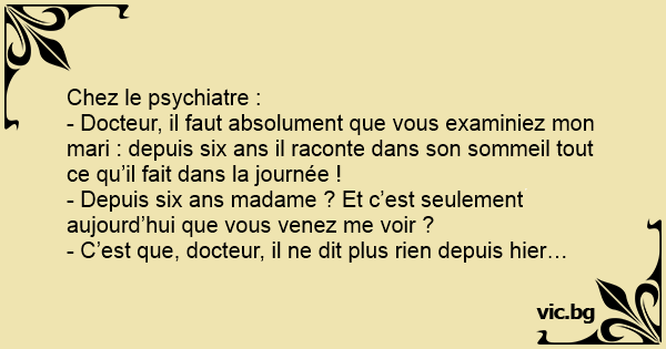 - Docteur, il faut absolument que vous examiniez mon mari : depuis six ans il raconte dans son sommeil tout ce qu’il fait dans la journée !