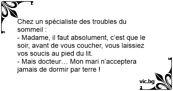 - Madame, il faut absolument, c’est que le soir, avant de vous coucher, vous laissiez vos soucis au pied du lit.