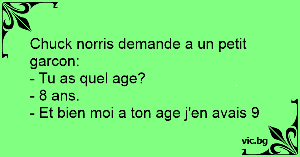 Chuck norris demande a un petit garcon: - Tu as quel age? - 8 ans. - Et bien moi a ton age j'en avais 9