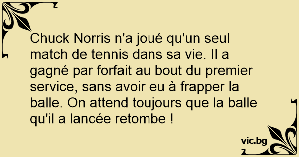Chuck Norris n'a joué qu'un seul match de tennis dans sa vie. Il a gagné par forfait au bout du premier service, sans avoir eu à frapper la ваllе. On attend toujours que la ваllе qu'il a lancée retombe !