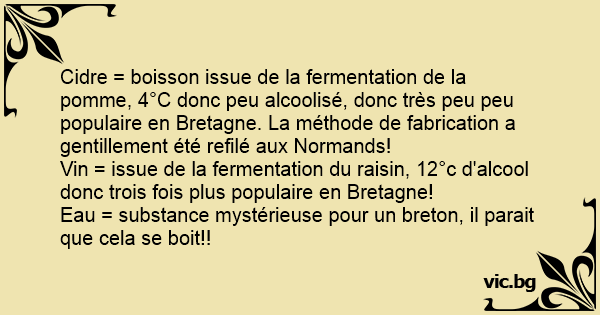 Vin = issue de la fermentation du raisin, 12°c d'alcool donc trois fois plus populaire en Bretagne!