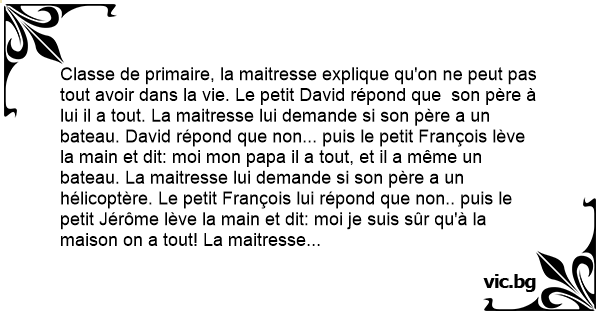 Classe de primaire, la maitresse explique qu'on ne peut pas tout avoir dans la vie. Le petit David répond que son père à lui il a tout. La maitresse lui demande si son père a un bateau. David répond que non... puis le petit François lève la main et dit: moi mon papa il a tout, et il a même un bateau. La maitresse lui demande si son père a un hélicoptère. Le petit François lui répond que non.. puis le petit Jérôme lève la main et dit: moi je suis sûr qu'à la maison on a tout! La maitresse s'énerve et dit: qu'est-ce qui te fait croire que vous avez tout chez vous? Le petit Jérôme dit: hier soir pendant le repas, ma soeur a dit qu'elle était enceinte et mon père a dit: рuтаin, il nous manquait plus que ça..